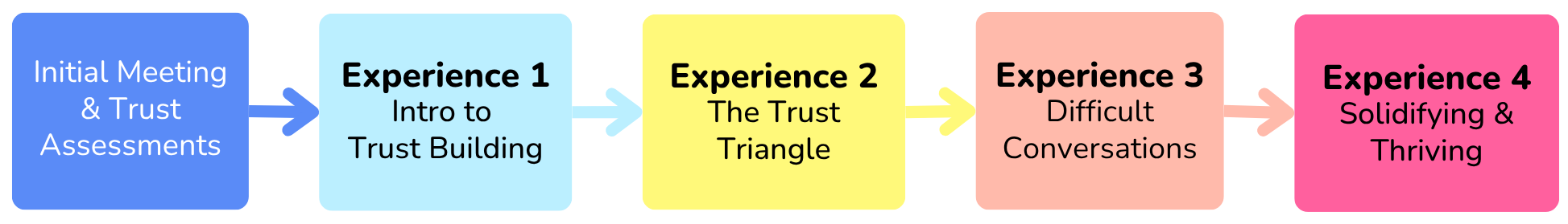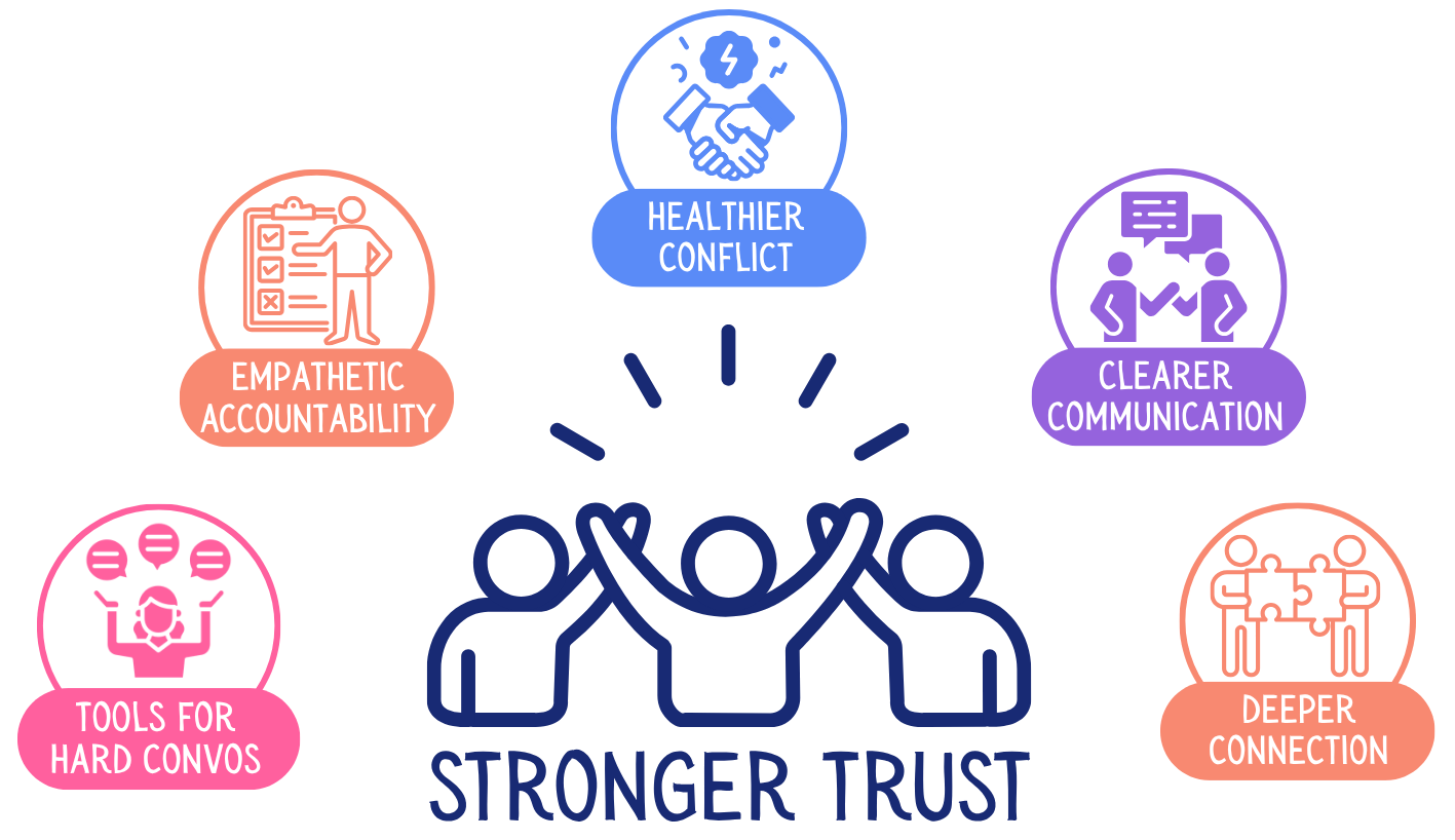 We believe trust building isn’t a one-time event, but it is a dynamic skill that transforms a group of individuals into a unified team. Our methodology is built on a progressive four-part journey: moving from the Foundations of Trust and the Trust Triangle into the essential skills of Difficult Conversations, and culminating in Solidifying, Repairing, & Thriving. To build on these lessons, we provide teams with monthly exercises designed to keep the momentum alive. This approach moves leaders away from isolation and into a high-performing, human-first team where trust and accountability drive collective results.